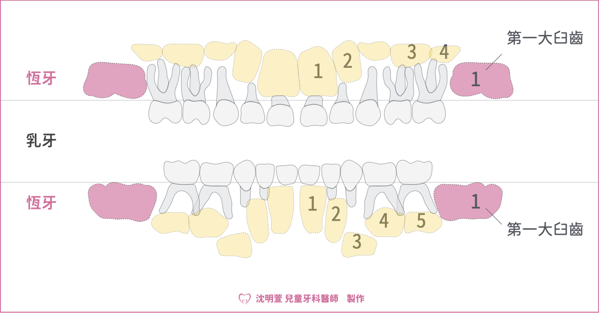 要提醒家長的是,最後面的第一大臼齒(紅色)跟門牙會在同一時間開始長牙。第一大臼齒長牙時,不會先掉乳牙,常常被忽略,因而疏於清潔而導致蛀牙。